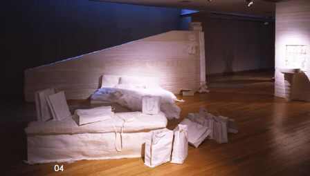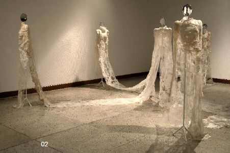 在我们今天的都市生活中,消费成为衡量大都市的一个重要指标,在全球化的环境中,跨国的消费现象借助都市的平台,根本地改变了旧有的地域性的消费习惯,越来越趋向于人工化、全球化的倾向。现代都市的消费行为返身影响着我们的日常生活,塑造着我们新的生活方式,就像汽车影响着我们对距离的理解,方便面、麦当劳影响孩子们的饮食习惯一样。我们已经不再是没有衣穿的时候买衣服,缺少某物的时候买某物,通常的情况下,我们是被消费推动着去消费,于是生活中出现了比比皆是的“购物狂”。当我们了解到我们日益依赖的生活环境中充斥着垃圾、充斥着对人体的危害,充斥着对大自然万劫不复的破坏的时候,我们更是对人类的消费现象充满了警觉,对消费之物的“误质”充满了批判的责任。60年代的总体艺术形态就以其批判的锋芒指向对于都市消费形态的审视,今天纤维与软雕塑创作更是一个伴随着思考警觉的过程,是我们接近事物之时一种批判性的方向。它们从不同的方面对今天的消费现象提出批判性的思考,以造“误”来造物。“造误”是在物自身的展示之中,揭示现代消费中的物的荒悖,揭露物的某种“误”,来唤起人们对都市消费现象的警觉,对自己日常生活异化倾向的警觉。作品《缚》呈现的是一只只包扎缠绕成型的布瓶,它们已然不再是容器,歪歪扭扭,伤痕累累,形态各异却又如此相似。是昨天,今天,还是明天?你们,我们,还是他们?同样,作品《碎片》反映了当下社会流行的“人造”面孔,越来越具有趋同的美感,它们掩饰了越来越多的真实表情,渐渐变化为漂亮的面具。以垃圾袋和废弃的边角料制作的《食》和人造《有机蔬菜》,是对今天众多非自然食物的警觉。《争· 挣· 狰》系列则以无数只痉挛的、畸形的、相互盘绕的手臂,诠释着在一个被丰盈物质充斥着的世界中,充满欲望的人们在物质化世界中的种种精神状态。《内@外.com(时裳游戏)》以反串的角色来揭示现实生活中关于着装、言行、地位、权利和身份的问题。《都市泡沫》以泡沫的真实、虚幻和消解来解读都市。同样以一次性纸巾塑造的《物品·生活·她》,隐喻着永无停歇地更换,随时可取,随时可弃。材料的选择恰到好处地应对了主题的深化。作品《缺席》以象征人类最原初生命状态的丝绵,塑造了一具具形体,人作为主体的缺席,形成一座缺乏思想的躯壳,镜子中的自我诱发人们对自己的审视和对社会的思考。《迷城&迷人》更是以废弃的、留有工业制造痕迹的印刷纸翻制成的泰迪熊,来警示人们不要习惯于成为这个世界中的一个玩偶,而是要有自己独立的思想和思考。这些作品所使用的材料大部分是消费材料本身,甚至是一次性消费材料。有的通过材料的错置来造成陌生化的效果,有的带着戏仿的方式不动声色地指出物的荒谬,它们以日常生活材料来还原日常生活本身。这些方法都极大地调动了青年学生现代消费的经验,易于开启他们的个性感受,使他们从一开始就手握生活化和批判性的两把利刃来涉入当代艺术思考。作品呈现了新一代青年对社会生活的思考,有着独特的艺术形态和鲜明的时代色彩。